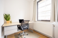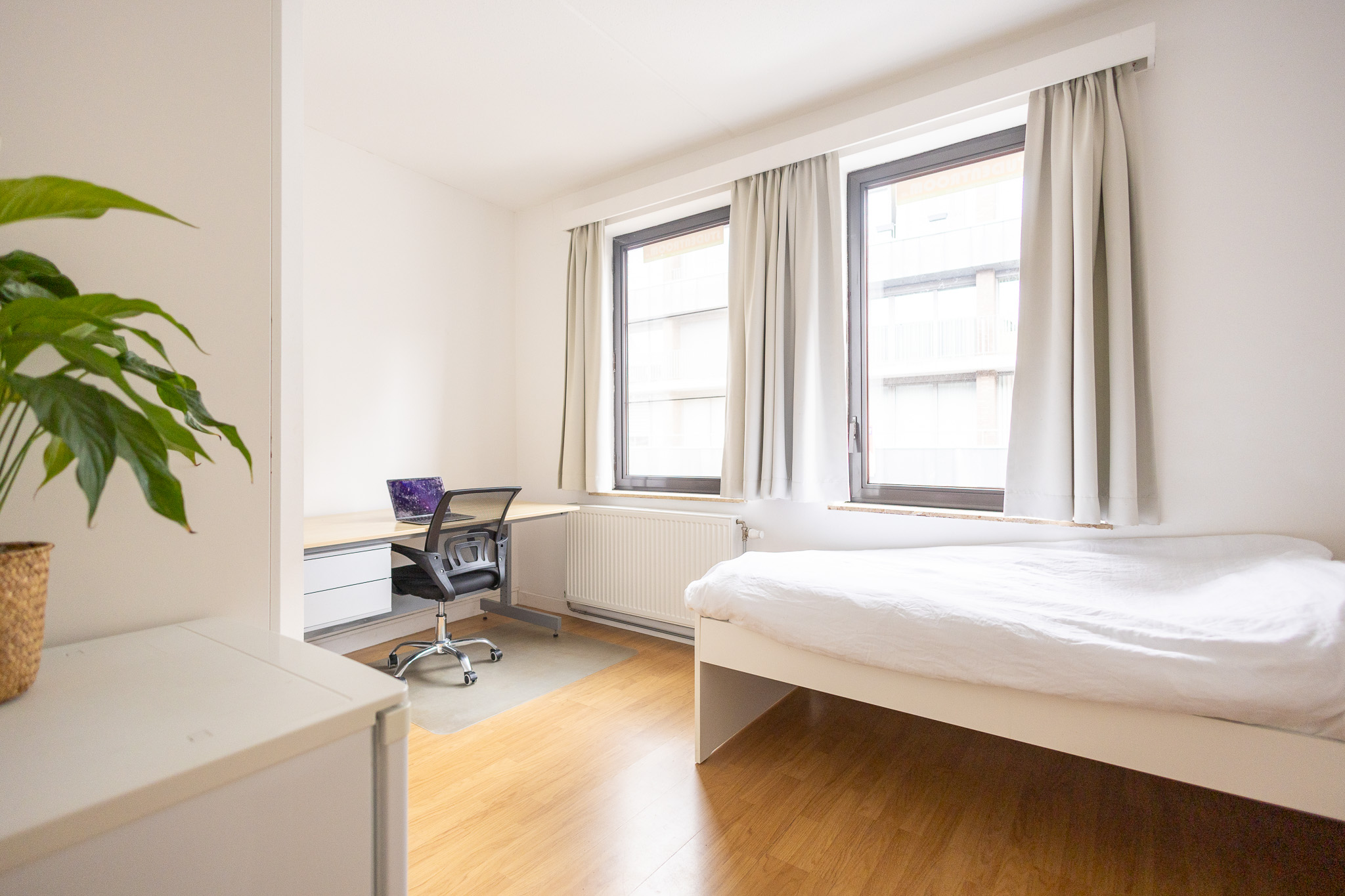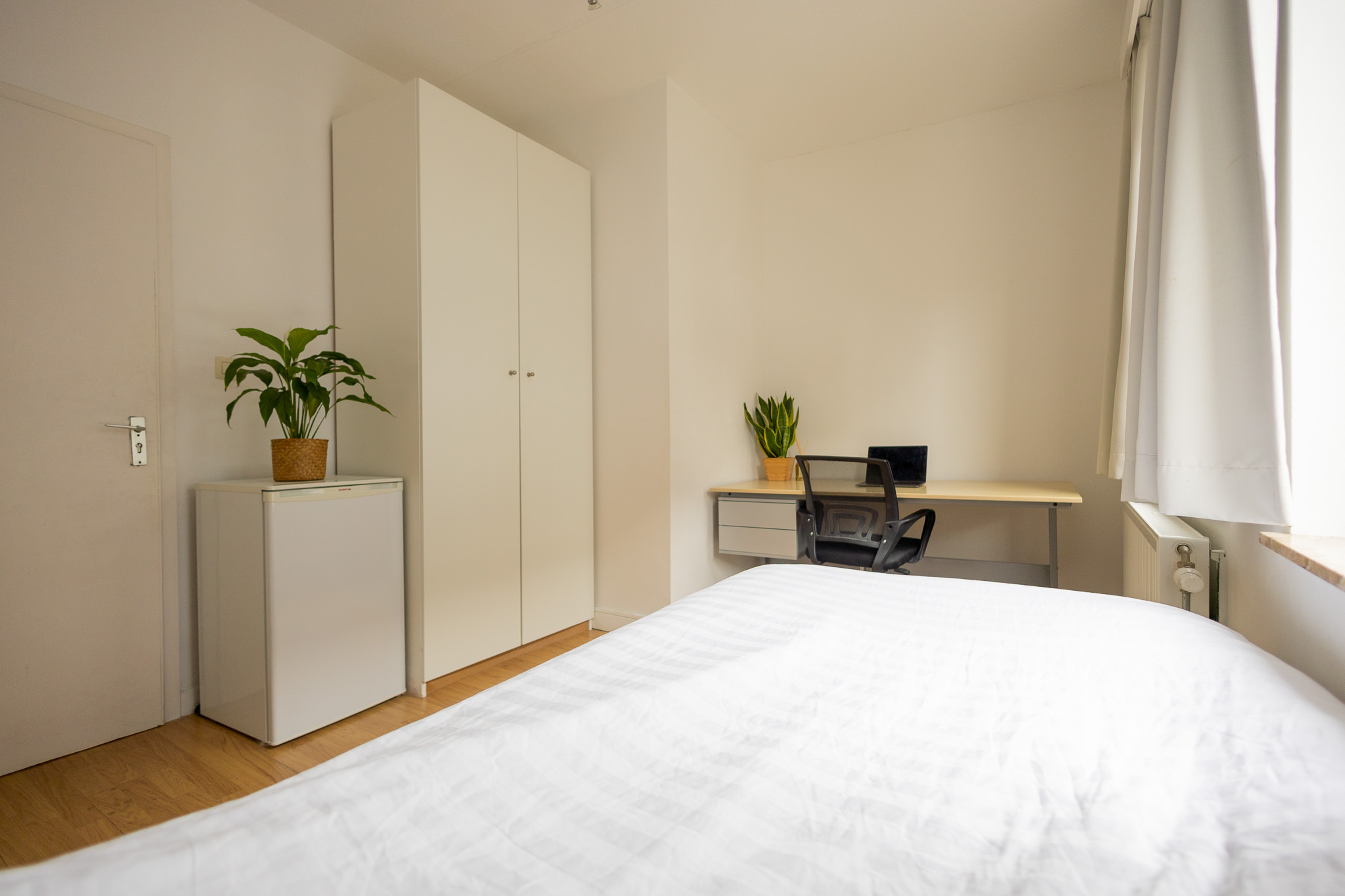 Deze kamer beschikt over veel natuurlijk licht dankzij de grote ramen, wat zorgt voor een open en aangenaam woongevoel. De kamer is volledig bemeubeld en instapklaar, met een bed, bureau met bureaustoel, ijskast, ruime kleerkast én een eigen wastafel voor extra dagelijks comfort.